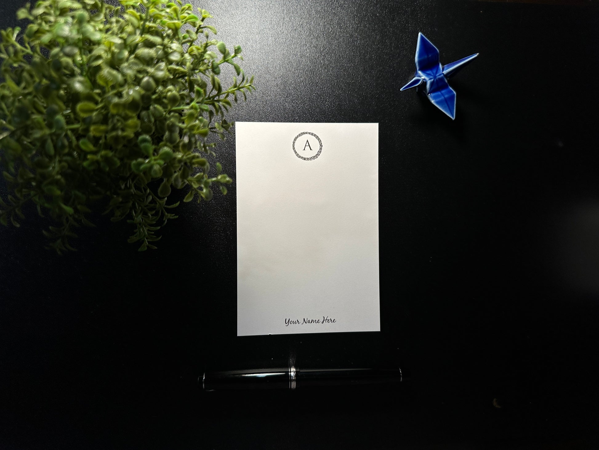 This notepad comes padded in a set of 40 sheets. Product size is 3.75" x 5.5". You may also personalize the notepad at no additional cost by choosing from our wide selection of fonts. By default, we use the same font for your monogram and name. You may also opt for different fonts for the monogram and your name. If so, pls. indicate your font choices including the initial and name you would like to be printed in the text box.