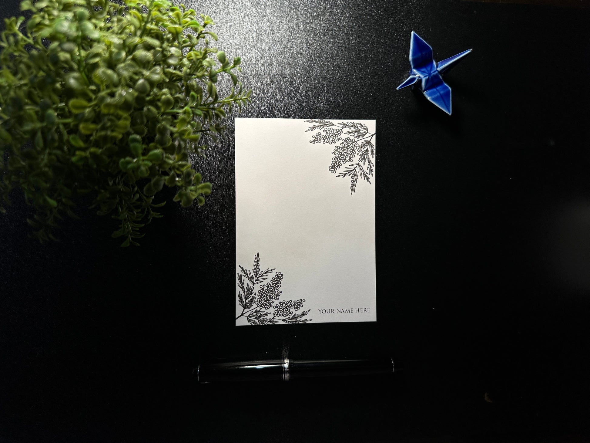 We use off-white paper for our notepads that is smooth. Our notepads are made from FSC Certified paper and are fountain pen friendly too! We use a thickness of at least 100gsm for our pads.